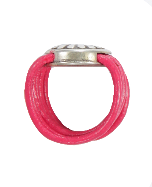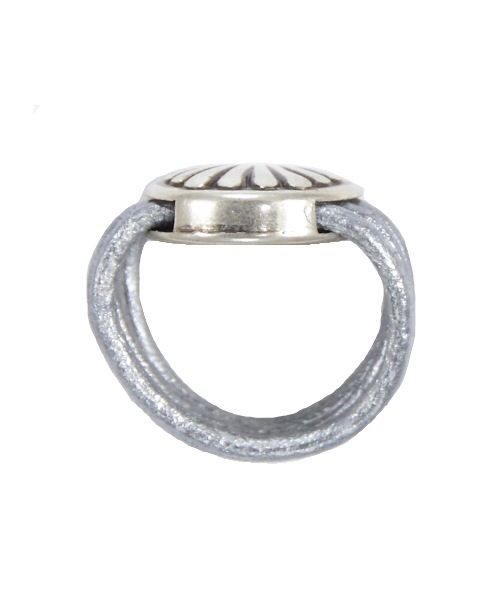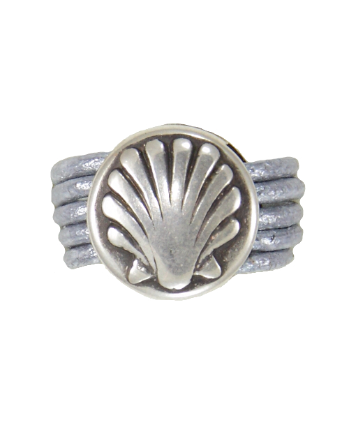 Anillo con varias vueltas de cuero disponible en varios colores y entrepieza de zamak plateado con la concha de Santiago de Compostela.