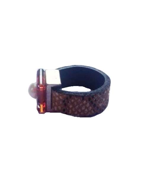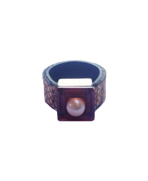 Anillo con cuero ancho en tono mostaza, con cuadrado de Swarovski rojo sobre base de zamak plateado y una perla de río en el centro del cristal de Swarovski.