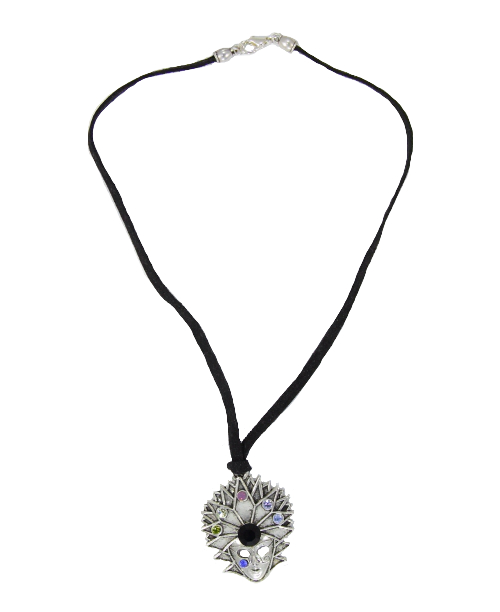 Colgante corto con máscara de Venecia y cristales de Swarovski en varios colores, ante y cierre plateado.