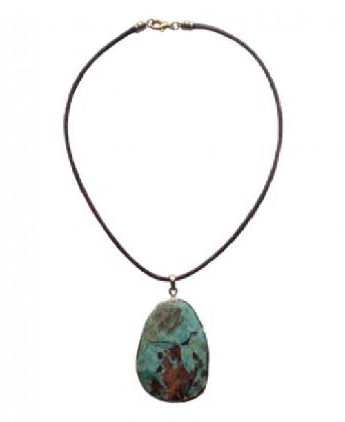 Colgante corto con gema verde engarzada con bordes dorados y napa marrón.