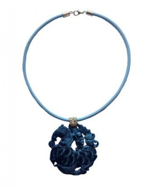 Colgande de jade azul de 6,4 centímetros de diámetro con un mono encima de un caballo. El cuero es gris claro y los acabados dorados.