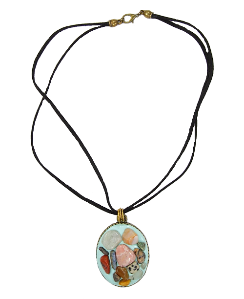 Colgante corto con varios minerales en distintos tamaños sobre fimo tirquesa y una base de camafeo en dorado viejo con antelina.