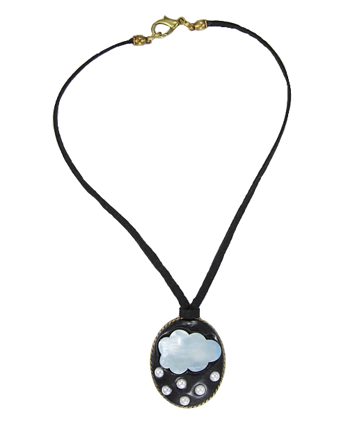 Colgante corto con una nube azul de nácar sobre fimo negro y perlas blancas pegadas en una base en dorado viejo y antelina negra.