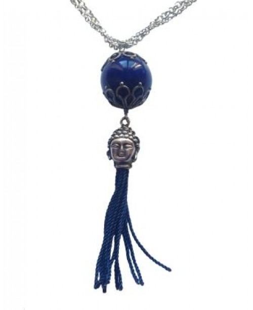 Collar plateado con doble cadena, cerámica azul entrlazada y un terminal en forma de Buda.
