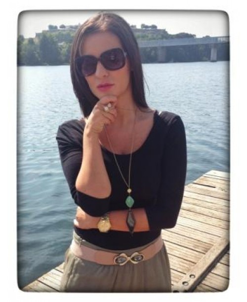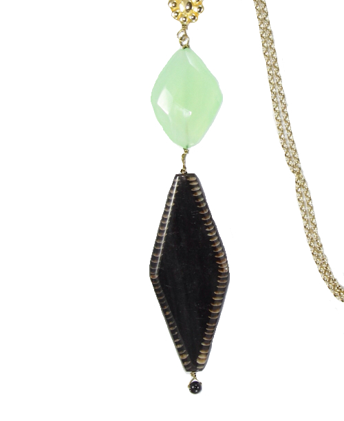 Collar largo con un rombo de jade y otro de madera, cadena dorada y flor también dorada.