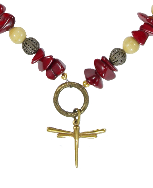 Collar corto con cierre de tuerca dorado viejo, cristal rojo y color crema, filigrana y libélula.