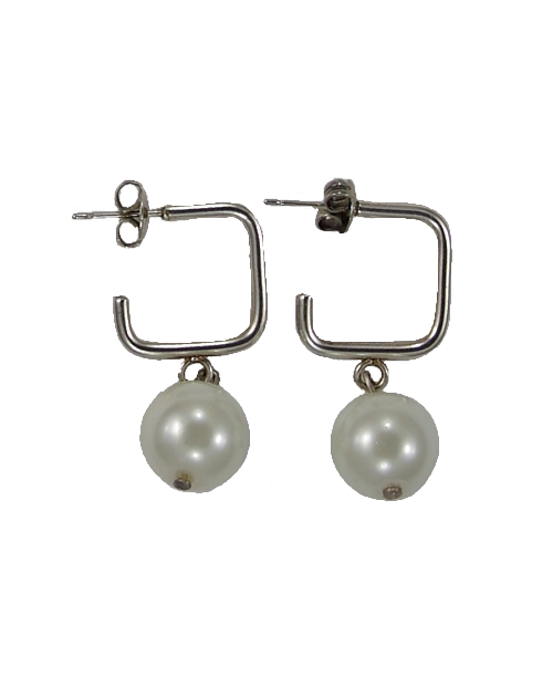 Pendientes con base cuadrada plateada y perla blan...