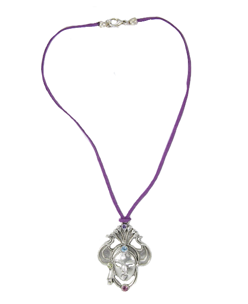 Colgante corto con máscara veneciana y crsitales de Swarovski, ante y cierre plateado.