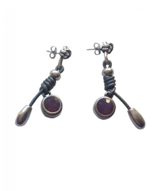Pendientes plateados con cuero plateado, y cristal de Swarovski violeta.