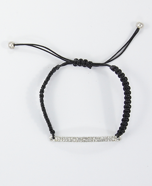 Pulsera ajustable con nudo macramé negro y línea disponible en dorado y en plateado con strass.