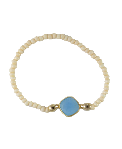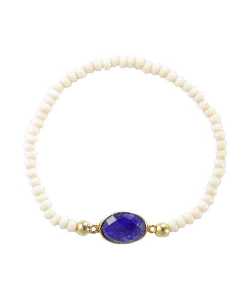 Pulsera elástica con minerales varios (lapislázuli, cuarzo turmalinado...) engarzados en plata dorada, entrepiezas de zamak dorado y rocallas color crema.